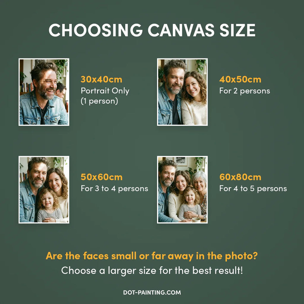 Die Größe ist entscheidend Während die kleinere Größe von 20x30 cm für einfache Bilder nett ist, empfehlen wir dringend, eine Größe von mindestens 30x40 cm oder 40x50 cm für das beste Ergebnis zu wählen. Die Faustregel beim Dot Painting ist einfach: Je größer die Leinwand, desto mehr Details können wir erfassen und desto atemberaubender wird dein fertiges Meisterwerk sein.